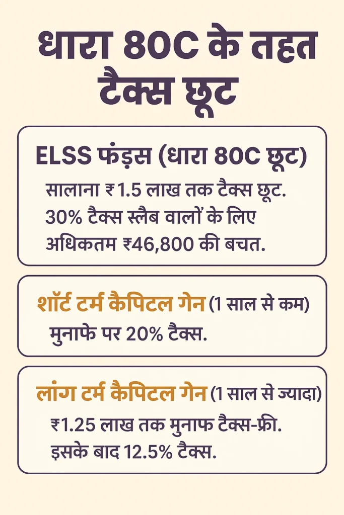 अगर आप ELSS फंड्स में निवेश करते हैं, तो आयकर अधिनियम की धारा 80C के तहत आपको हर साल ₹1.5 लाख तक की छूट मिल सकती है। इसका मतलब है कि अगर आप 30% टैक्स स्लैब में आते हैं, तो आप सालाना लगभग ₹46,800 तक टैक्स बचा सकते हैं।